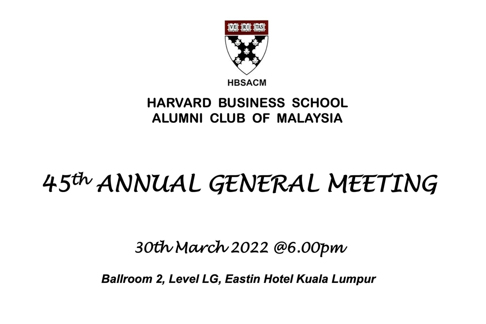 NOTICE IS HEREBY GIVEN THAT the 45th Annual General Meeting of the HBSACM will be held at Ballroom 2, Level LG, Eastin Hotel Kuala Lumpur, 13 Jalan 16/11, 46350 Petaling Jaya, Selangor, on Wednesday, 30th March 2022 at 6.00 pm.
